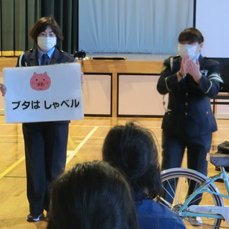 交通安全協会の皆様、呼人派出所のおまわりさん、市役所の皆様のご協力のもと、小学校の交通安全教室を行いました。まずは、体育館で説明を聞きます。ところで皆さんは、「ブタのしゃベル」という合言葉をご存知ですか。自転車に乗る際の注意点を覚えるための言葉です。私は今日、初めて聞きました。内容は・・・是非お子さんに聞いてみてください(言えるかな?)。その後は、外で自転車や歩行の実地訓練。子ども達は皆、安定した乗り方で自転車を運転していましたよ。